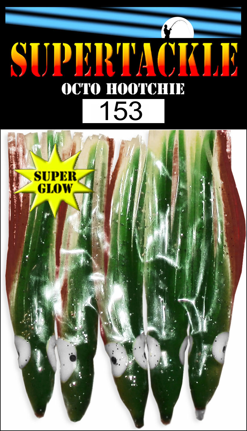 Dark green with dark red strips and a glow white belly. Tube type hollow soft plastic fishing skirt. Tube type hollow soft plastic fishing skirt. Octo type body which is easy to rig for many fishing styles. Good for salt & fresh water fishing. Trolling, jigging and casting lure component.These fishing liures do not have any swim action. The component will require a swim action enhancement if trolled or casted. Enhancers can range from dodger, flasher, spinner or plastic swim head. These can also be fitted with buzz spinners or mini LED lights.