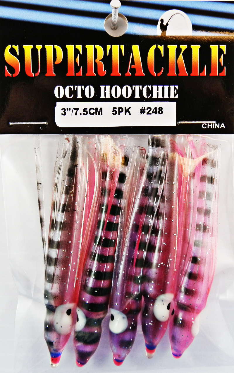 Black dash over transparent purple. Tube type hollow soft plastic fishing skirt. Octo type body which is easy to rig for many fishing styles. Good for salt & fresh water fishing. Trolling, jigging and casting lure component.These fishing liures do not have any swim action. The component will require a swim action enhancement if trolled or casted. Enhancers can range from dodger, flasher, spinner or plastic swim head. These can also be fitted with buzz spinners or mini LED lights.