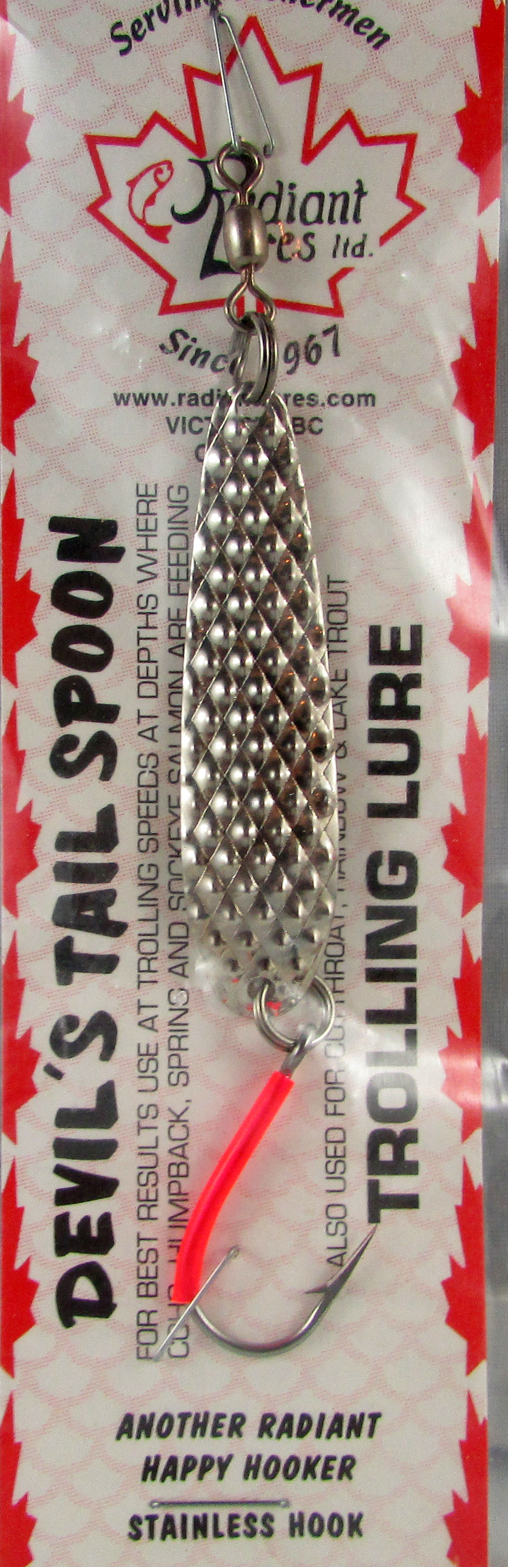 Salmon trolling spoon made of the best materials available. 2.75" blade length. SS Siwash Mustad hook. Ultra violet hook wrap. Fish scale pattern