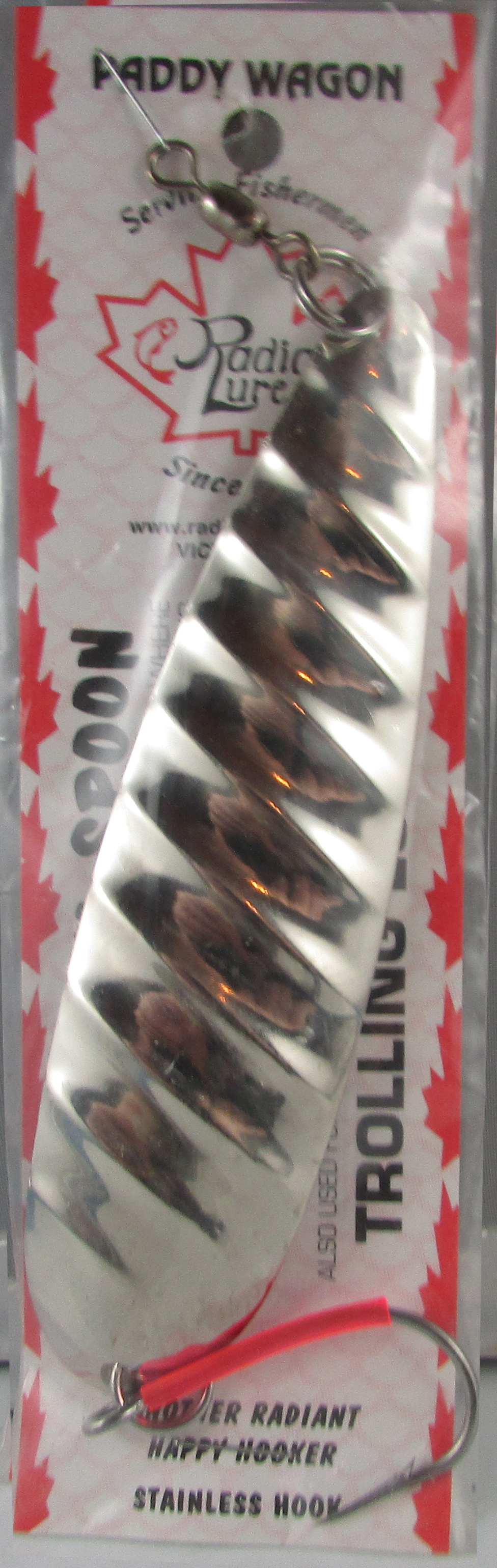 Salmon trolling spoon made of the best materials available. 4.5" blade length. SS Siwash Mustad hook. Ultra violet hook wrap. Fish scale pattern