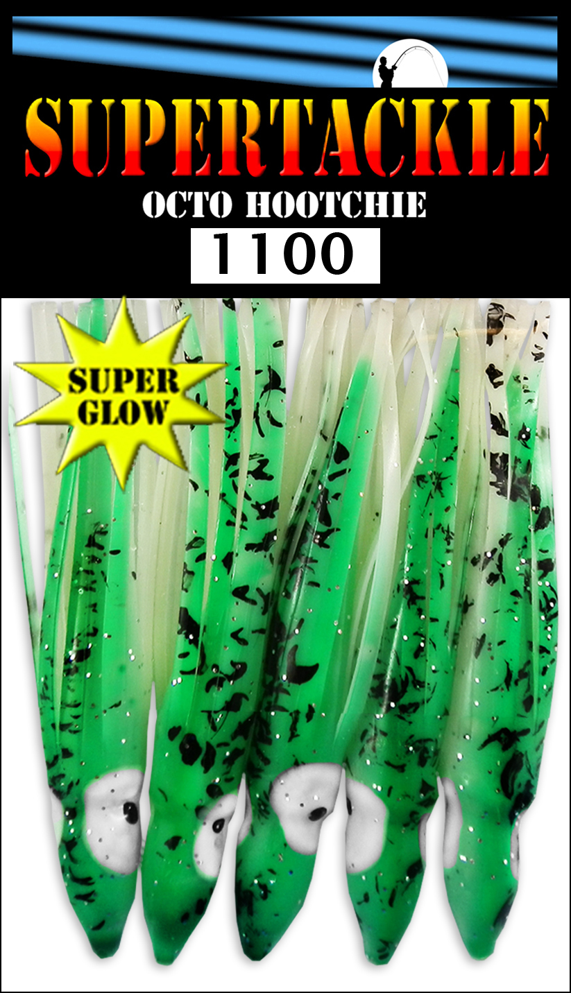 Stencil spatter back over green glow white. Tube type hollow soft plastic fishing skirt. Octo type body which is easy to rig for many fishing styles. Good for salt & fresh water fishing. Trolling, jigging and casting lure component.These fishing liures do not have any swim action. The component will require a swim action enhancement if trolled or casted. Enhancers can range from dodger, flasher, spinner or plastic swim head. These can also be fitted with buzz spinners or mini LED lights.