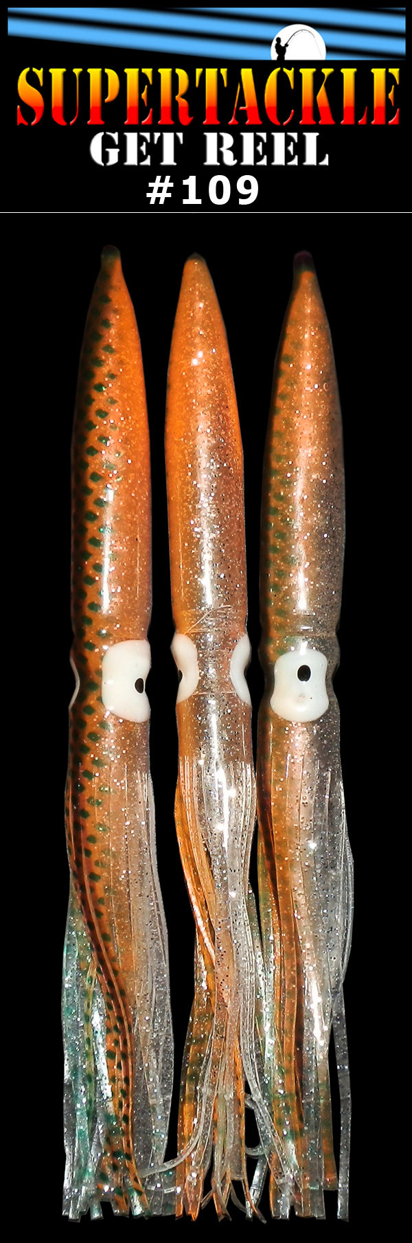 6.5" Get Reel 109 PT UV salmon fishing hoochies, squid type 3/pk