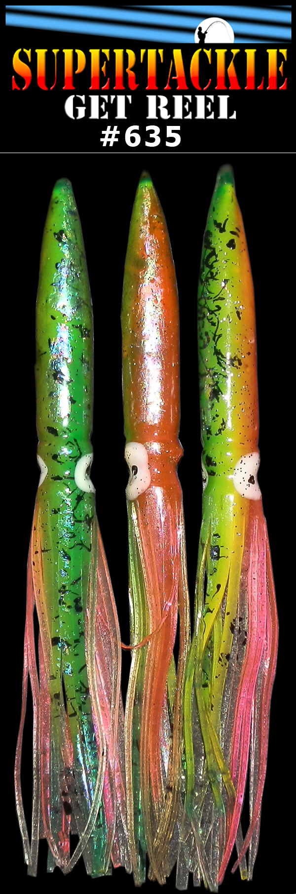 6.5" Get Reel 635 Rotcoddam UV salmon fishing hoochies, squid type 3/pk