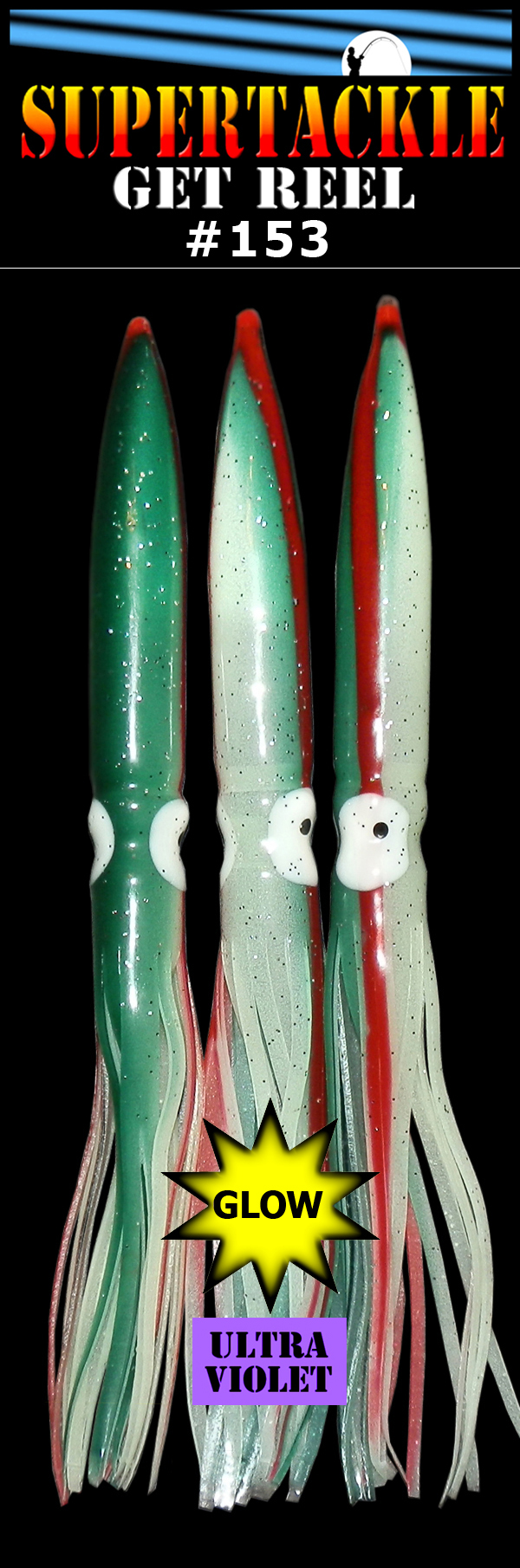 6.5" - Get Reel GLOW 153 Army Truck salmon fishing hoochies, squid type 3/pk
