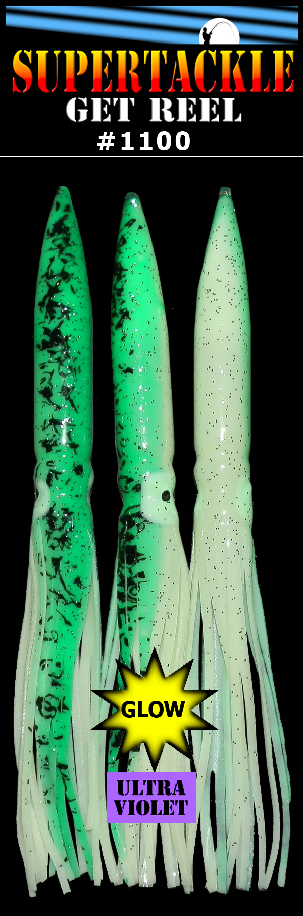 6.5" - Get Reel GLOW 1100 Alligator salmon fishing hoochies, squid type 3/pk