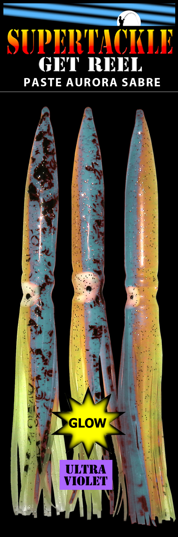 6.5" - Get Reel GLOW Paste Aurora Sabre salmon fishing hoochies, squid type 3/pk