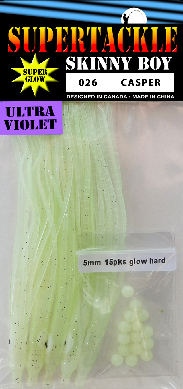 Milky white glow Skinny Boy hoochie fishing squid. Supertackle's best representation of Sand Lance and Needlefish patterns. Hollow tube type soft plastic Salmon fishing bait. Ultra violet enhanced to increase visibility at deeper trolling depths. Proven effective for most species of salmon and bottom dwelling fish.Easily rigged with beads or lead and a hook. These fishing lures do not have any action and require a flasher & downrigger setup to be successful. The success rate is similar and sometimes better than frozen herring bait. If Sandlance or Needlefish are spawn in your area in the sand, this is our best recommendation.