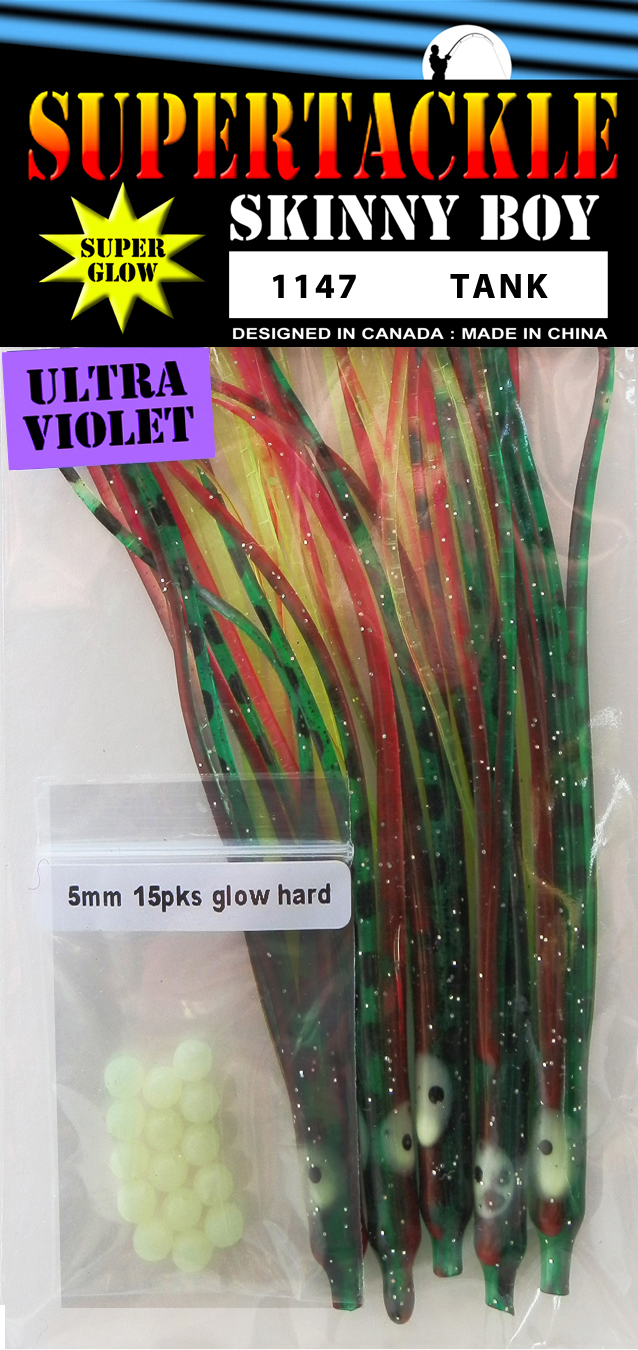 4.5" Supertackle Glow #1147 TANK Skinny Boy, salmon trolling needlefish 5/pk