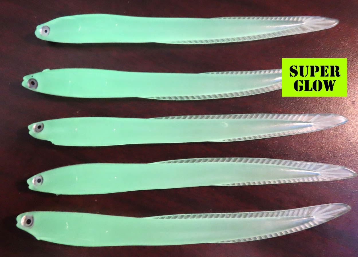 Solid injection molded soft plastics. Realistic painted eyes. Durable & bendable. Suggest rigging with twin octopus type hooks. Not a castable weight. Suggest trolling with an action enhancer such as Wigglefin. Could be fished in many ways.Glow can be charge with sunlight, flashlight or UV flashlight.