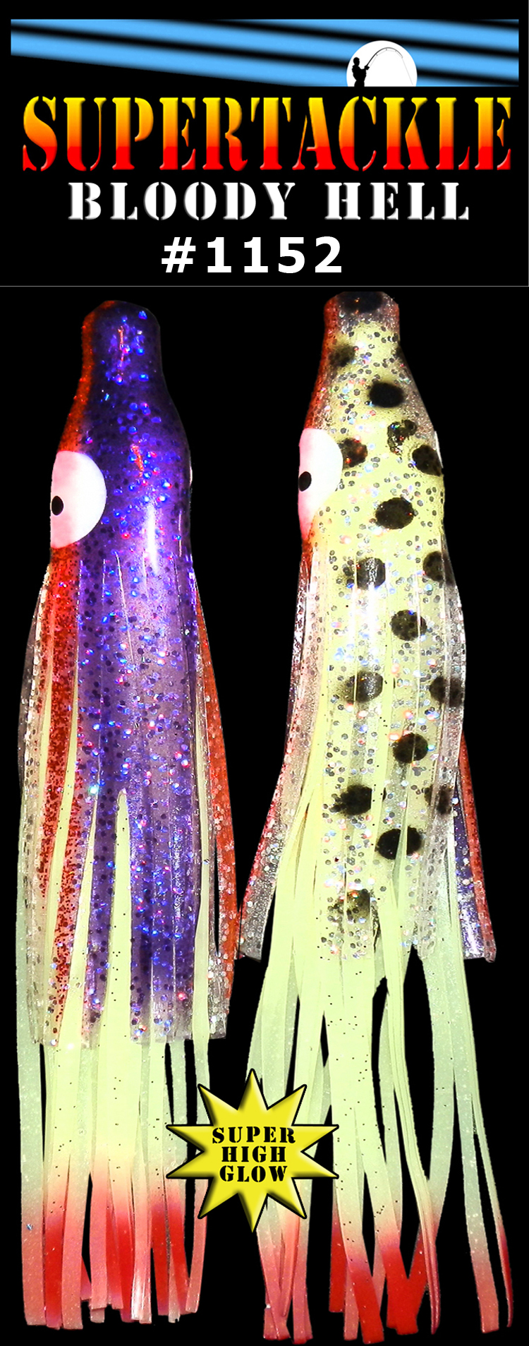 Double layered skirts are 7½" inner and 5½" outer shell. Red tail is an added attraction on our Body Hell series. These are very thick and also have a strong type of phosphorescent glow material. Hollow tube type soft plastic fishing bait. High glow and ultra violet enhanced to increase visibility at deeper trolling depths. Proven effective for most species of large bottom dwelling fish. Also proven on larger predator fish in a trolling fashion. Easily rigged with beads or lead and a hook.2 per pack