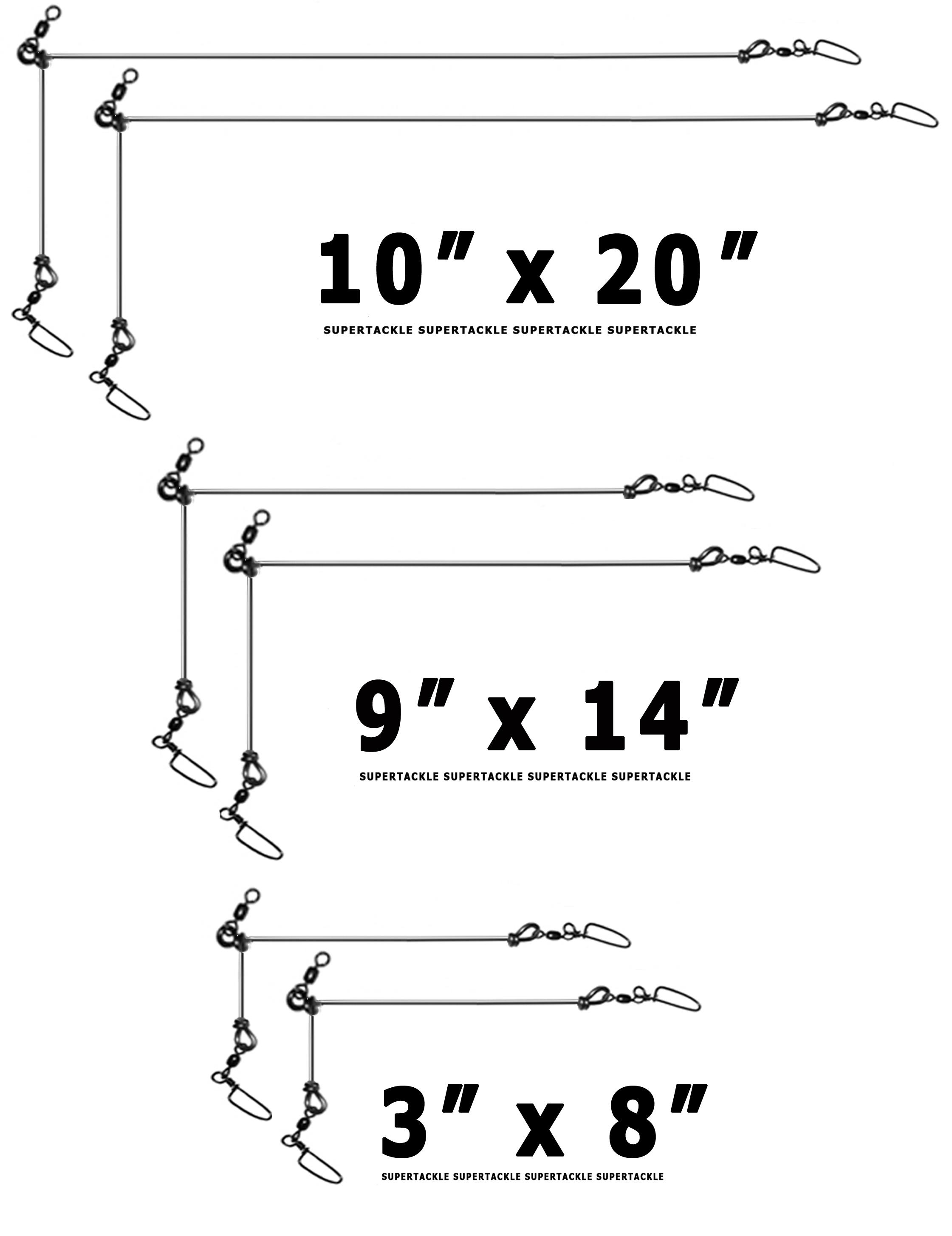 Enhance your fishing experience with these Supertackle S/S Spreader Bars. These stainless steel bars are perfect for both inshore saltwater and freshwater fishing. The negative buoyancy of these spreader bars ensures that they stay underwater, making them ideal for catching a variety of fish species such as Giant Trevally (GT), Halibut, Carp, Salmon, Shark, Mackerel, Flounder, Northern Pike, Walleye, bass, grouper, and Catfish. These spreader bars come in a pack of four and are a great addition to your fishing equipment. The silver color of these spreader bars makes them attractive to fish, and their 50 g (1.764 oz) weight adds to their effectiveness. Get your hands on these Supertackle S/S Spreader Bars and give yourself the best chance of catching the fish of your dreams.The swivels are 4/0 nickle plated bronze. The clips are plated spring steel.
