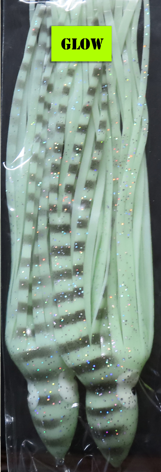 Solid Milky White Glow with Ghost Strips.Hollow, soft plastic trolling or jigging lure. Easily rigged with beads or lead sinkers and a hook. These are commonly referred to as a hootchie, hoochies or octopus skirt.