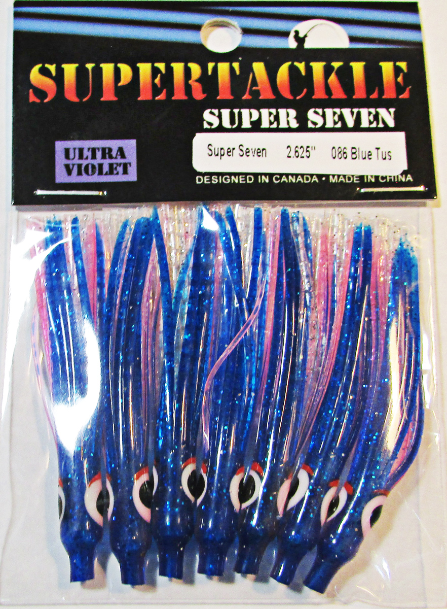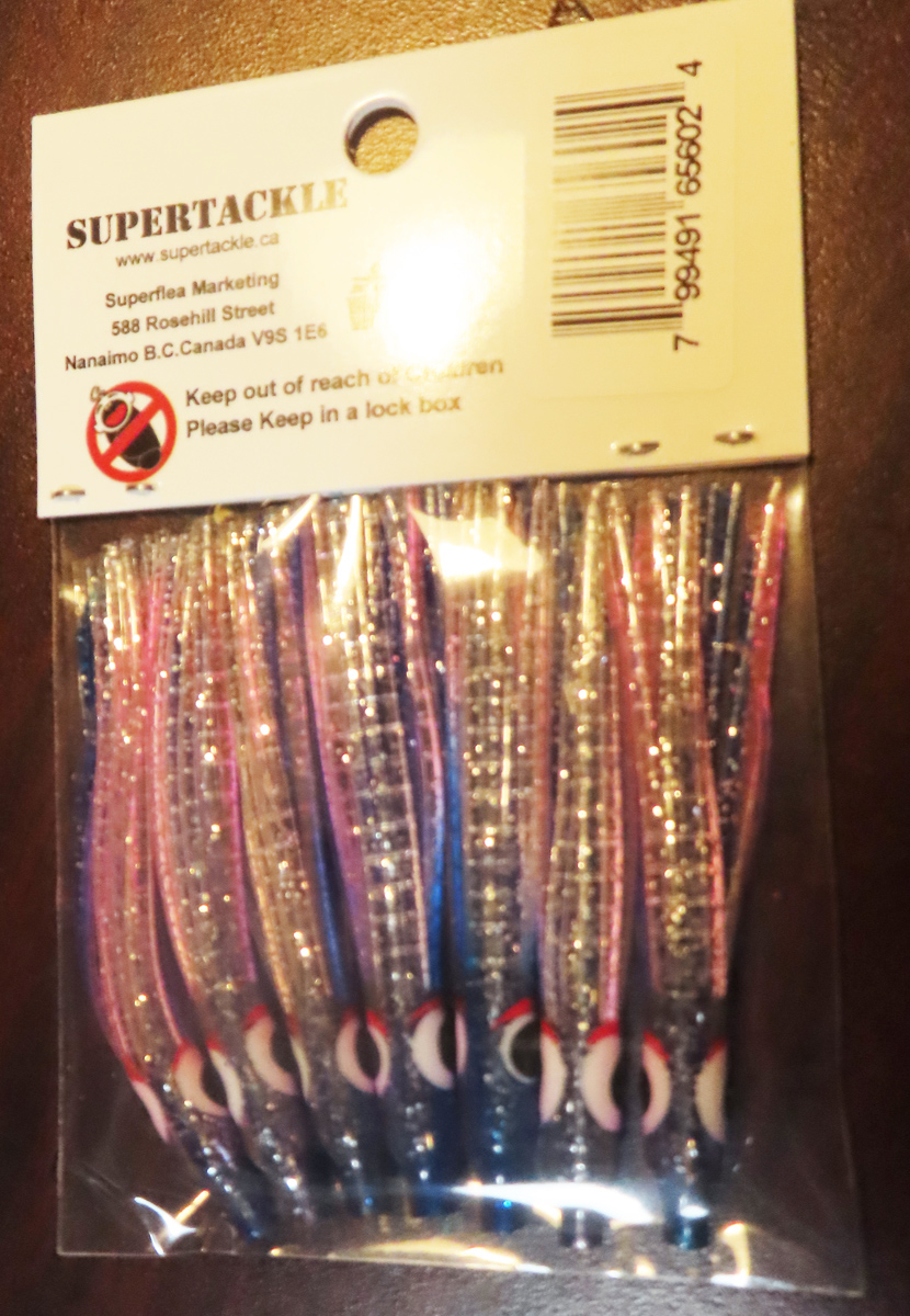 Ultra Violet, Blue, Magenta & Glitter hoochie fishing squid. Supertackle's best representation Minnow, Sandlance & Needlefish patterns. Hollow tube type soft plastic Salmon, Bass & Big Lake fishing bait. Ultra violet enhanced to increase visibility at deeper trolling depths. Proven effective for most species of salmon and bottom dwelling fish.Easily rigged with beads or lead and a hook. These fishing lures do not have any action and require a flasher & downrigger setup to be successful. The success rate is similar and sometimes better than frozen herring bait. If Sandlance or Needlefish are spawn in your area in the sand, this is our best recommendation.