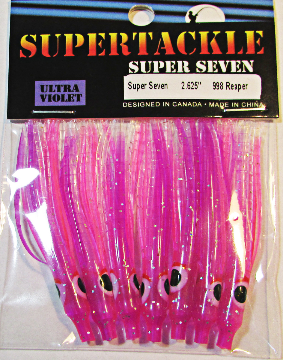 Highly Ultra Violet. hoochie fishing squid. Supertackle's best representation Minnow, Sandlance & Needlefish patterns. Hollow tube type soft plastic Salmon, Bass & Big Lake fishing bait. Ultra violet enhanced to increase visibility at deeper trolling depths. Proven effective for most species of salmon and bottom dwelling fish.Easily rigged with beads or lead and a hook. These fishing lures do not have any action and require a flasher & downrigger setup to be successful. The success rate is similar and sometimes better than frozen herring bait. If Sandlance or Needlefish are spawn in your area in the sand, this is our best recommendation.