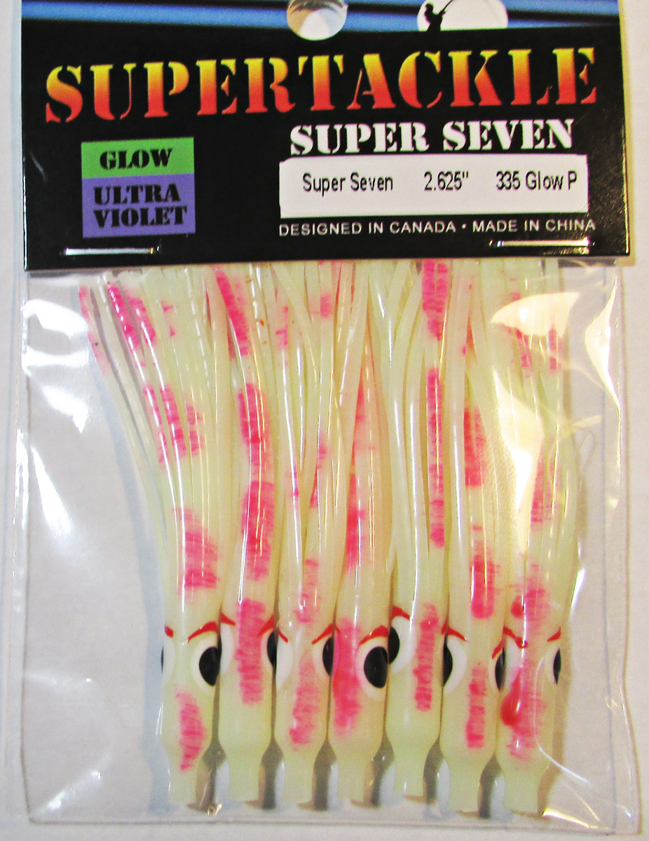 Ultra Violet & Glow in the Dark, Milky White Glow with UV Pink Splashes hoochie fishing squid. Supertackle's best representation Minnow, Sandlance & Needlefish patterns. Hollow tube type soft plastic Salmon, Bass & Big Lake fishing bait. Ultra violet enhanced to increase visibility at deeper trolling depths. Proven effective for most species of salmon and bottom dwelling fish.Easily rigged with beads or lead and a hook. These fishing lures do not have any action and require a flasher & downrigger setup to be successful. The success rate is similar and sometimes better than frozen herring bait. If Sandlance or Needlefish are spawn in your area in the sand, this is our best recommendation.