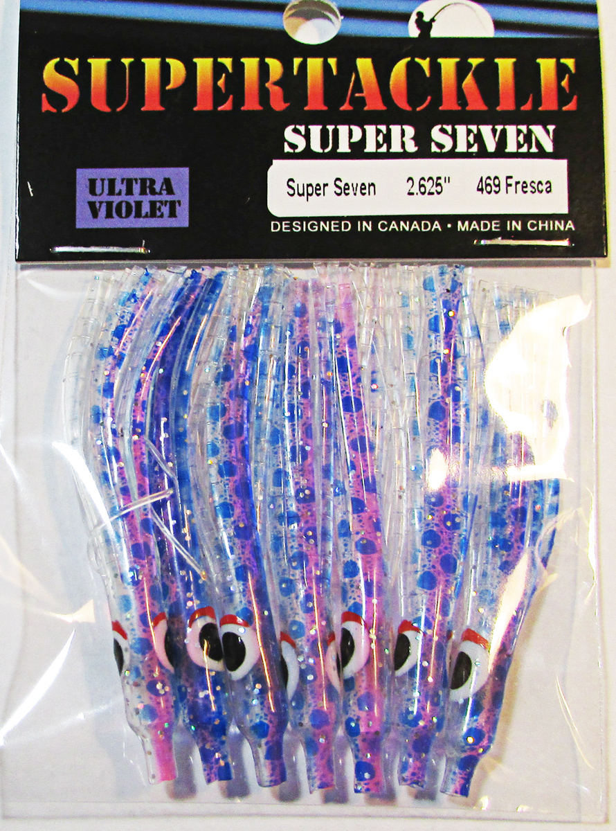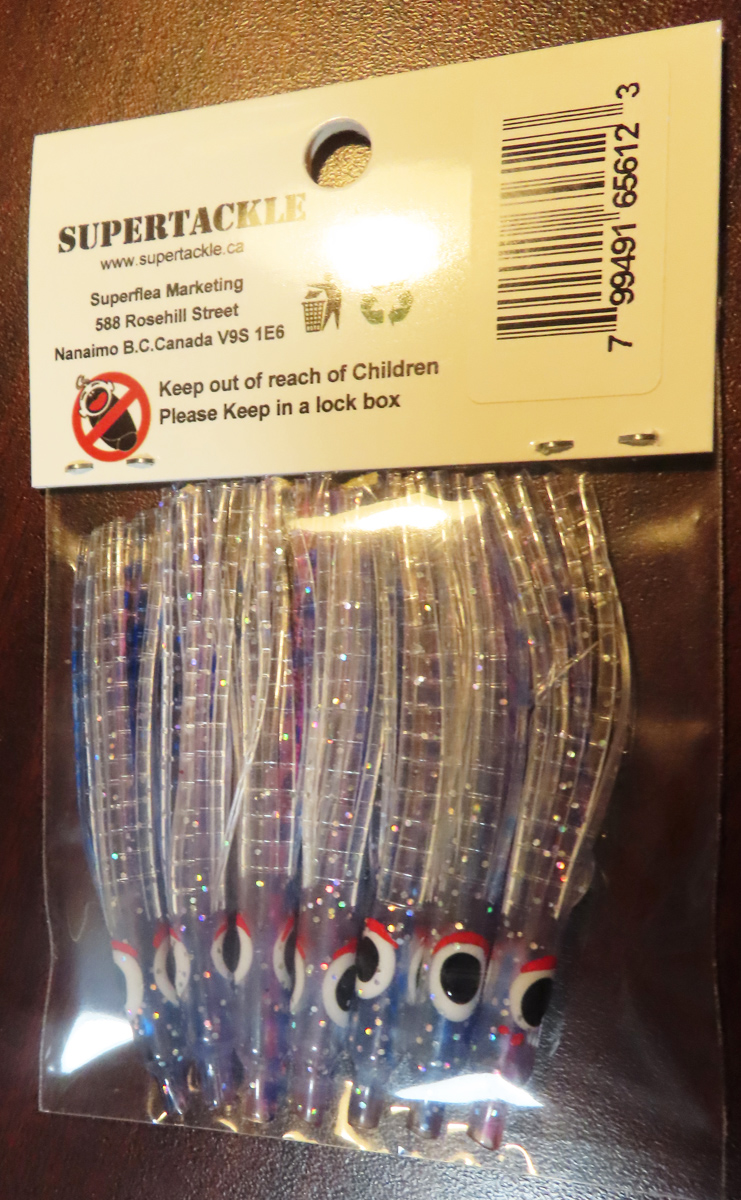 Ultra Violet Purple, Blue Dot & glitter enhanced. enhanced with glitter & hoochie fishing squid. Supertackle's best representation Minnow, Sandlance & Needlefish patterns. Hollow tube type soft plastic Salmon, Bass & Big Lake fishing bait. Ultra violet enhanced to increase visibility at deeper trolling depths. Proven effective for most species of salmon and bottom dwelling fish.Easily rigged with beads or lead and a hook. These fishing lures do not have any action and require a flasher & downrigger setup to be successful. The success rate is similar and sometimes better than frozen herring bait. If Sandlance or Needlefish are spawn in your area in the sand, this is our best recommendation.