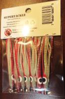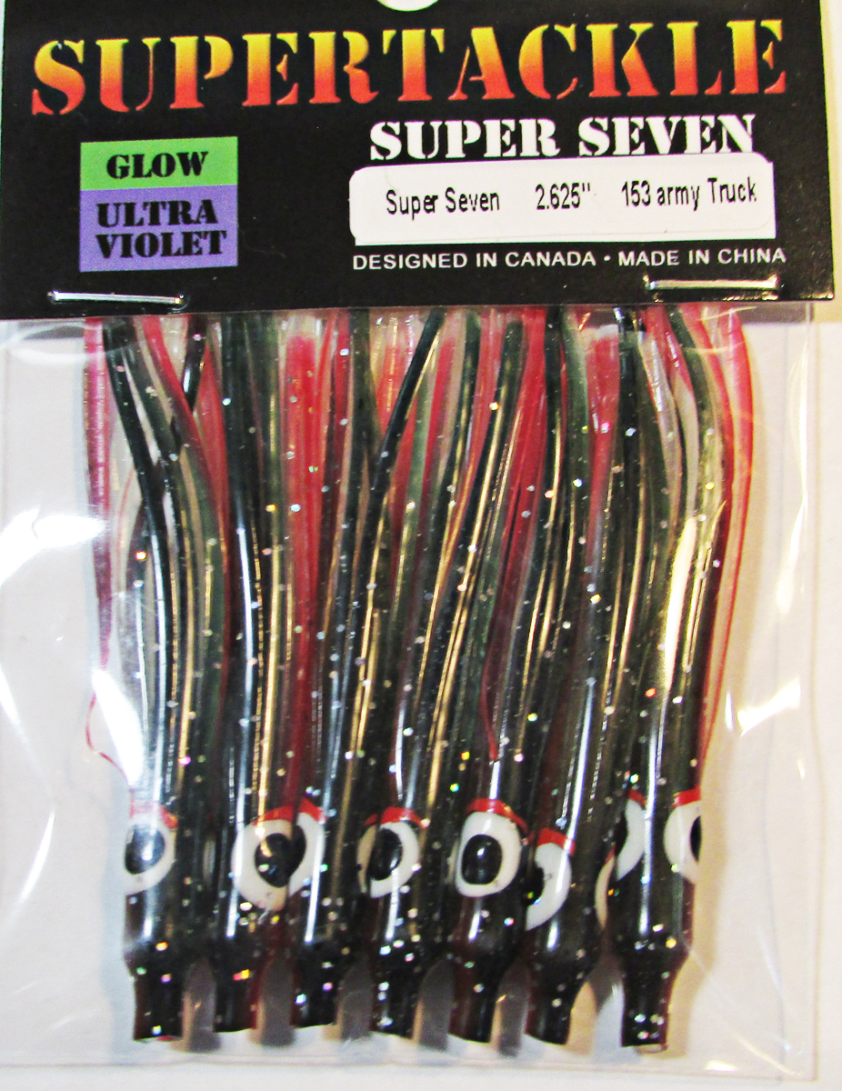Dark Green, Red & Ultra Violet White, hoochie fishing squid. Supertackle's best representation Minnow, Sandlance & Needlefish patterns. Hollow tube type soft plastic Salmon, Bass & Big Lake fishing bait. Ultra violet enhanced to increase visibility at deeper trolling depths. Proven effective for most species of salmon and bottom dwelling fish.Easily rigged with beads or lead and a hook. These fishing lures do not have any action and require a flasher & downrigger setup to be successful. The success rate is similar and sometimes better than frozen herring bait. If Sandlance or Needlefish are spawn in your area in the sand, this is our best recommendation.