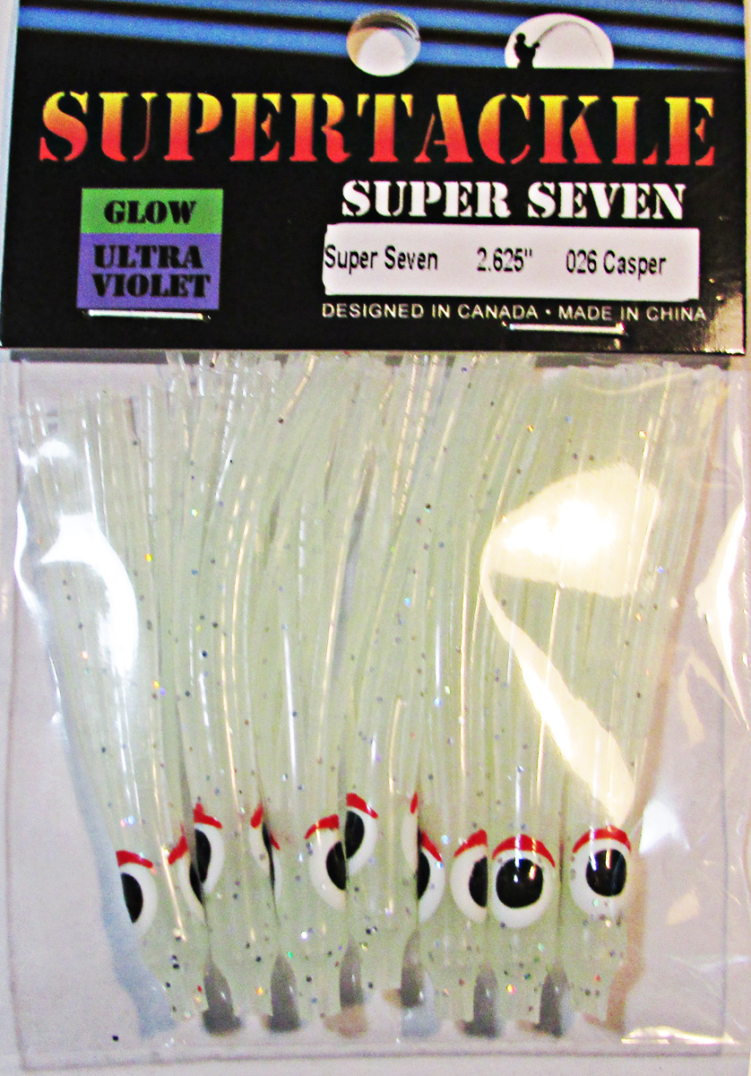 Ultra Violet Pink glow & UV enhanced with glitter, hoochie fishing squid. Supertackle's best representation Minnow, Sandlance & Needlefish patterns. Hollow tube type soft plastic Salmon, Bass & Big Lake fishing bait. Ultra violet enhanced to increase visibility at deeper trolling depths. Proven effective for most species of salmon and bottom dwelling fish.Easily rigged with beads or lead and a hook. These fishing lures do not have any action and require a flasher & downrigger setup to be successful. The success rate is similar and sometimes better than frozen herring bait. If Sandlance or Needlefish are spawn in your area in the sand, this is our best recommendation.