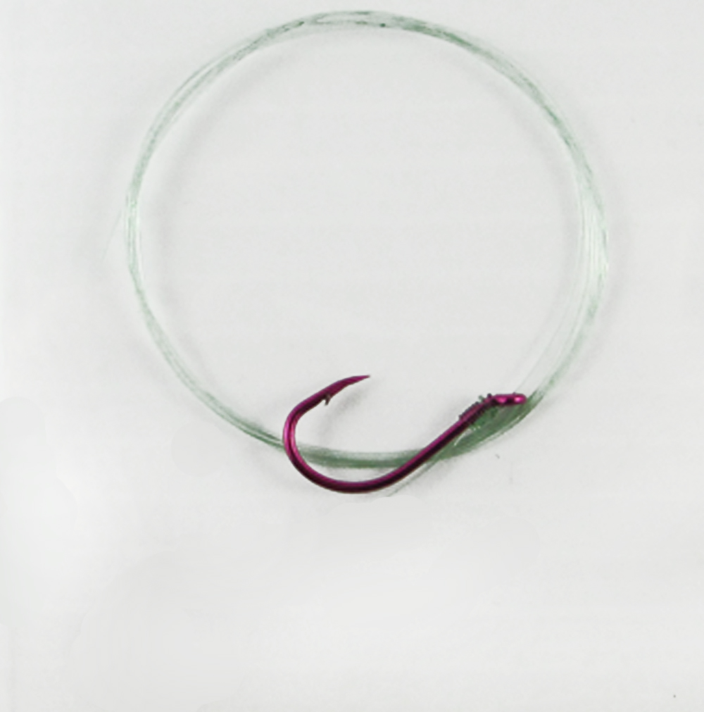 Universal leader for hoochies and soft plastic baits from 1" to 2" / 2.5 cm to 5 cm.The hooks are Supertackle ZAP #3 Magenta. Super strong and sharp. 36" leader is 14 pound mono. This leader can also be used as a bait harness.