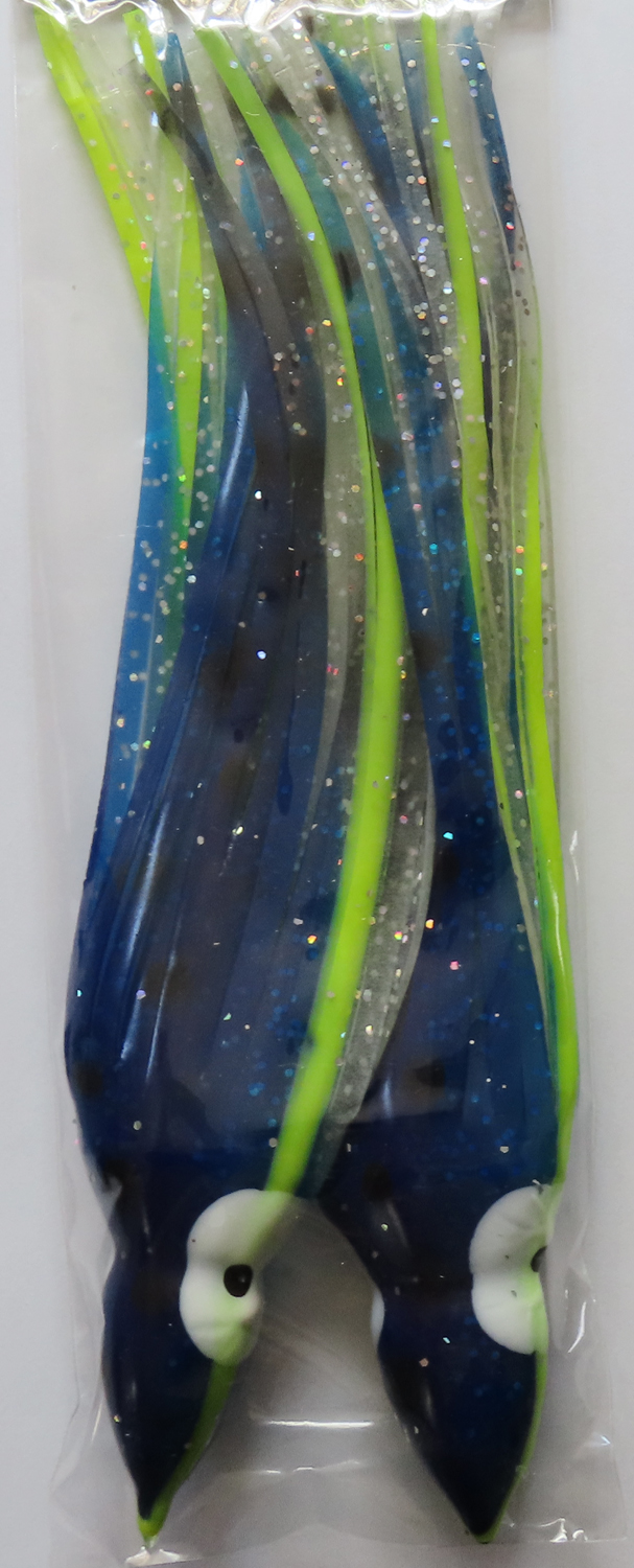Enhanced Blue with Yellow Stripes & Transparent Glitter Belly.Hollow, soft plastic trolling or jigging lure. Easily rigged with beads or lead sinkers and a hook. These are commonly referred to as a hootchie, hoochies or octopus skirt.