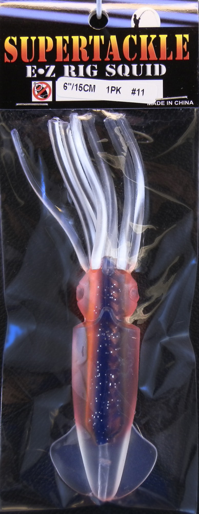 This Supertackle EZ Rig fishing lure is soft and gummy with a predesigned line hole in the nose. It has a similar texture to squid or octopus. The thickness of the body was fabricated using a solid injection mold.The cavity inside the lure has a diameter of ½" by 2½" long. The cavity can be used to hold a variety of embellishments such as an LED flasher, chum, glow beads or a weight.