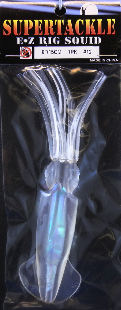 This Supertackle EZ Rig fishing lure is soft and gummy with a predesigned line hole in the nose. It has a similar texture to squid or octopus. The thickness of the body was fabricated using a solid injection mold.The cavity inside the lure has a diameter of ½" by 2½" long. The cavity can be used to hold a variety of embellishments such as an LED flasher, chum, glow beads or a weight.