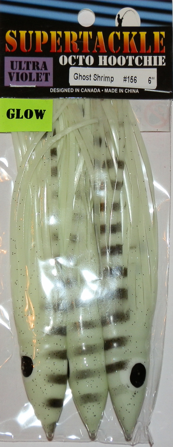 6" Supertackle Glow #156 GHOST SHRIMP big eye hoochies 3/pk