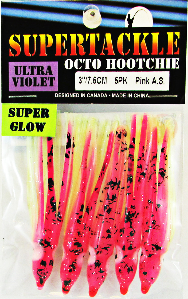 Pink spatter pattern over glow belly. Tube type hollow soft plastic fishing skirt. Octo type body which is easy to rig for many fishing styles. Good for salt & fresh water fishing. Trolling, jigging and casting lure component.These fishing liures do not have any swim action. The component will require a swim action enhancement if trolled or casted. Enhancers can range from dodger, flasher, spinner or plastic swim head. These can also be fitted with buzz spinners or mini LED lights.
