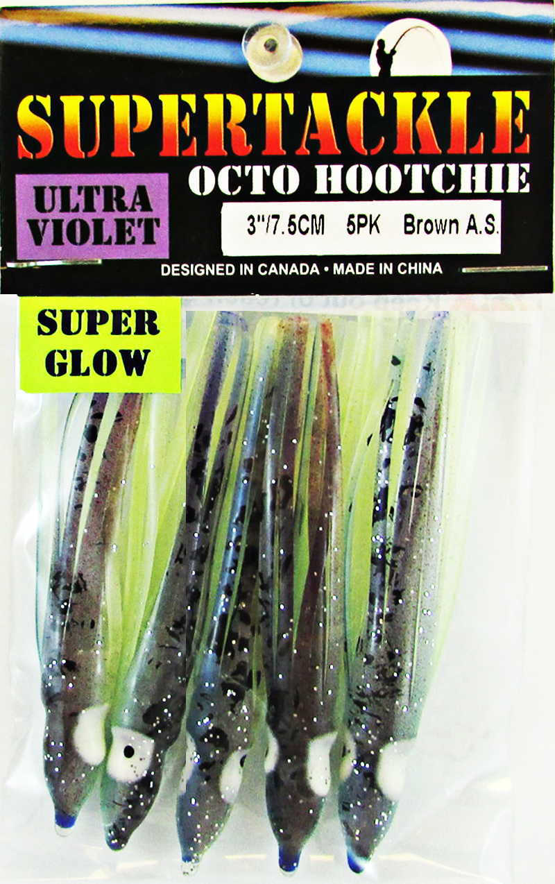 Brown spatter pattern over glow belly. Tube type hollow soft plastic fishing skirt. Octo type body which is easy to rig for many fishing styles. Good for salt & fresh water fishing. Trolling, jigging and casting lure component.These fishing liures do not have any swim action. The component will require a swim action enhancement if trolled or casted. Enhancers can range from dodger, flasher, spinner or plastic swim head. These can also be fitted with buzz spinners or mini LED lights.