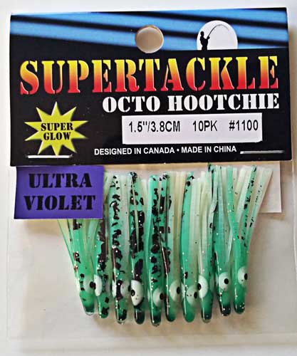 Spatter black over green with white glow belly.Hollow, soft plastic trolling or jigging lure. Easily rigged with beads or lead sinkers and a hook. These are commonly referred to as a hootchie, hoochie or octopus skirt.